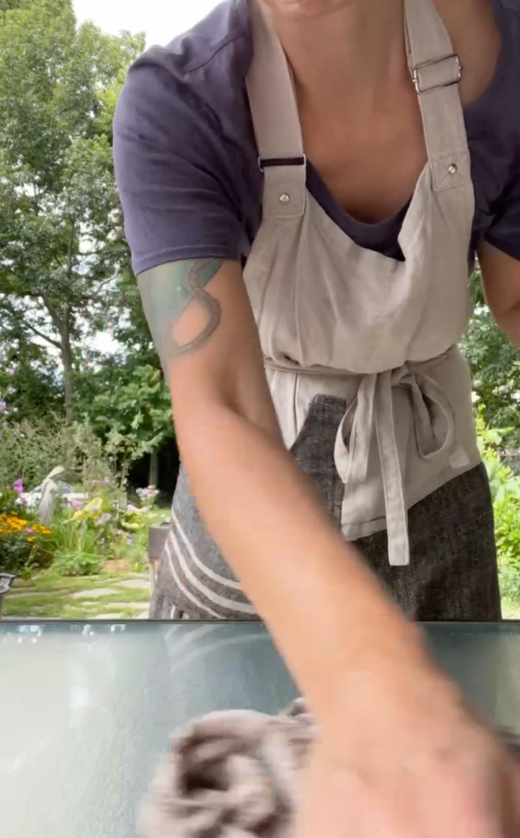 It’s a thick linen artisan piece. Oatmeal and gray with a giant pocket that holds elastic bands, a Sharpie and a lighter. My phone tucks in there too, as does a thin french tea towel that I can’t let my family use. It’s too soft. Too expensive. The latest nice thing I’m hiding from them.